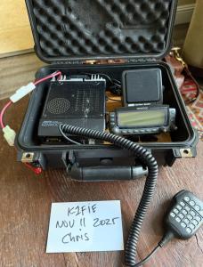 This is a ready to go POTA kit including the Kenwood TM-700 Dual Bander with Anderson power poles, MFJ-281 Clear Tone speaker, Kenwood hand mic with keypad, mounted in a black submersible padded Pelican case. The rig is mounted on finished wood, and the documentation is underneath the wood tray.