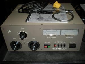 ALPHA 78 HF AMP. REMOVED FROM SK STATION SET-UP. NON-SMOKER. WAS ABLE TO PLUG IN AND IT POWERS UP. WIRED FOE 220. NO OTHER TESTING WAS DONE. SELLING FOR SK's WIDOW.