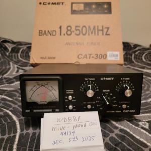 For Sale: Comet CAT-300 1.8 – 50 MHz 300W Manual Antenna Tuner. Original owner purchased from DX Engineering, from non-smoking home. Tunes antenna's of all sorts of very well-wide range tuner. Very nice color meter. New condition, and operates same way. CONUS only. Accept postal money order,cashiers check,personal check,ZELLE or Venmo, or cash for in-person sales. Price--$175 + shipping