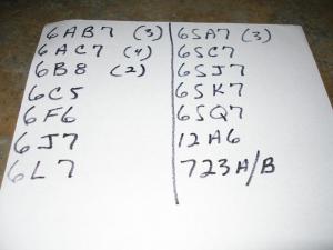 22 tubes I will never use. List enclosed as a picture. I believe most to be usable as tested at 80-90% on my tester. $25.00 plus shipping. 3 pounds from 44131.