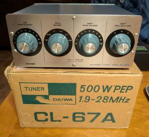 Very clean Daiwa CL-67A with factory box. Tunes 160 thru 10 meters. 500 w PEP capability so very conservative for typical HF rigs.