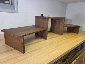 The shelving is made of heavy-duty 3/4" and 1" solid laminated pine boards with a dark stain, will easily support any amplifier. The overall length of the shelves is 82". The left and right shelves are angled inward. The table top is solid wood with a dark brown Formica laminate (88" x 36"). The overall length of the shelving is 82" and the depth is 17".