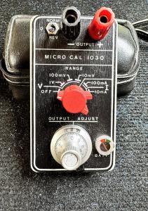 This is a Time Electronics 1030 MicroCal voltage and current source. It is a battery-operated DC voltage and current calibrator with 0.1 percent accuracy, three voltage ranges (0-10 mV, 0-100mV, 0-1V) and two current ranges (0-10mA, 0-100mA). An addditional 0-8V range is possible with an external precision 1K resistor.