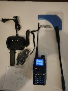 For sale I have a like new Baofeng AR-5RM triband (2m/1.25m/70cm) HT with all stock accessories-drop in charger, earpiece, manual, stock antenna, battery, and USB charging cable . The battery has a USB-C charging jack on it so you don't have to take the drop in charger when you travel, just use your phone charger.