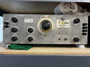 AR-8503 by Radiomarine Corp of America, the marine division RCA. Tunes from 15Kc to 600 Kc. Apparently when these receivers were released after WW2, the procedure was to deface the nameplate. Other photos are available. Clean inside. Mounted on original shocks. The receiver was working recently. I have not re-checked for operation, but I will do so soon and modify this ad with the result. $250 plus shipping.