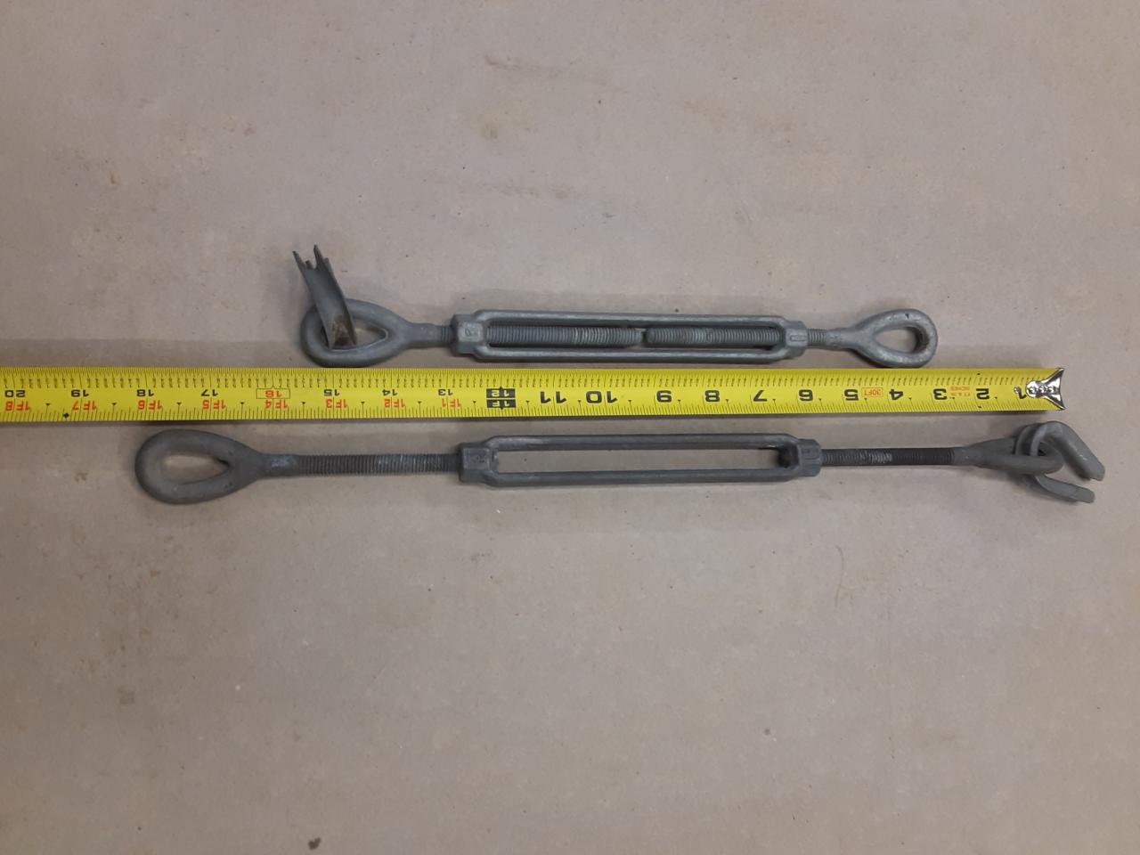 Galvanized turnbuckles. Eye ends. 7 inch centers. Used for 3/16th and 1/4 inch guy wire. Selling in groups of ten. 3 groups available. Price: $75.00 each group includes shipping to the lower 48 states. Payment via PayPal or check.