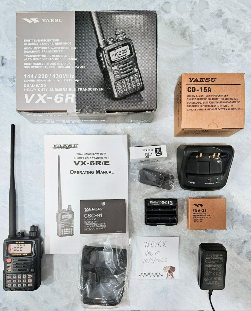 Yaesu VX-6R triband HT. Tons of features packed in to a small package. Very convenient size to take along on a walk. Battery lasts very long time. Wideband receiver with air band. MARS/CAP mode done. I loved it so much that I bought two and now selling one. Here's what's included: