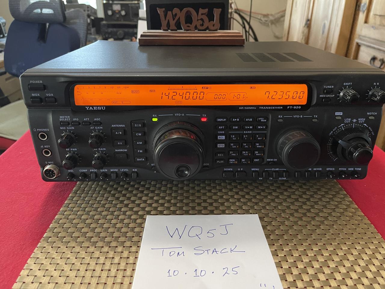 Extremely clean Yaesu FT-920 Transceiver - covers all of HF plus 6 Meters. The receiver covers 0.1 - 30 MHz as well as 48 - 56 MHz and has a built in, great working, tuner with DSP as well as adjustable High and Low cuts to shape the receive signal. Has 127 memories and puts out 100 Watts.