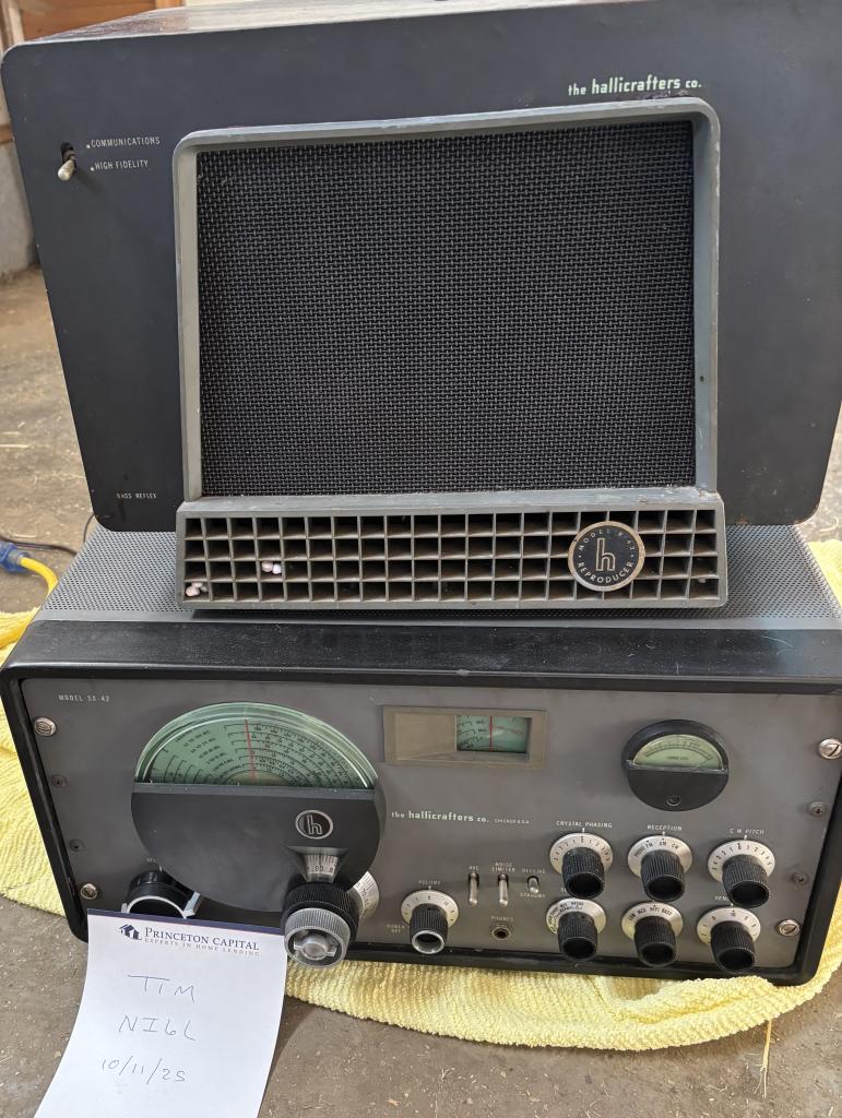 Clean, WORKING SX-42 receiver with Reproducer speaker. Have video of it receiving WWV on 15 MHz with 2 foot wire on floor in garage. Will need to be gone through but working and with very little hum. Original, no mods and I have owned for 34 years. Been in closet most of last ten years. Front panel is 9. /10. Cabinet is 8.5 / 10. Reproducer front panel is 9.5, cabinet has scuffs and a few rust spots but a repaint would make it look very nice. as is it’s a 6/ 10. Still presentable.