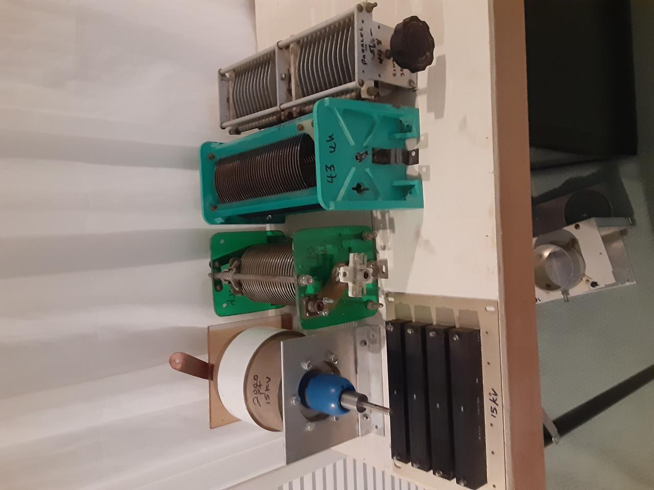 Left to right , 15 kv 2000pf vacuum cap, 15 kv rectifier bank, 18 uh roller, 43 uh roller, twin 220pf est 5kv air variable. Testing interest