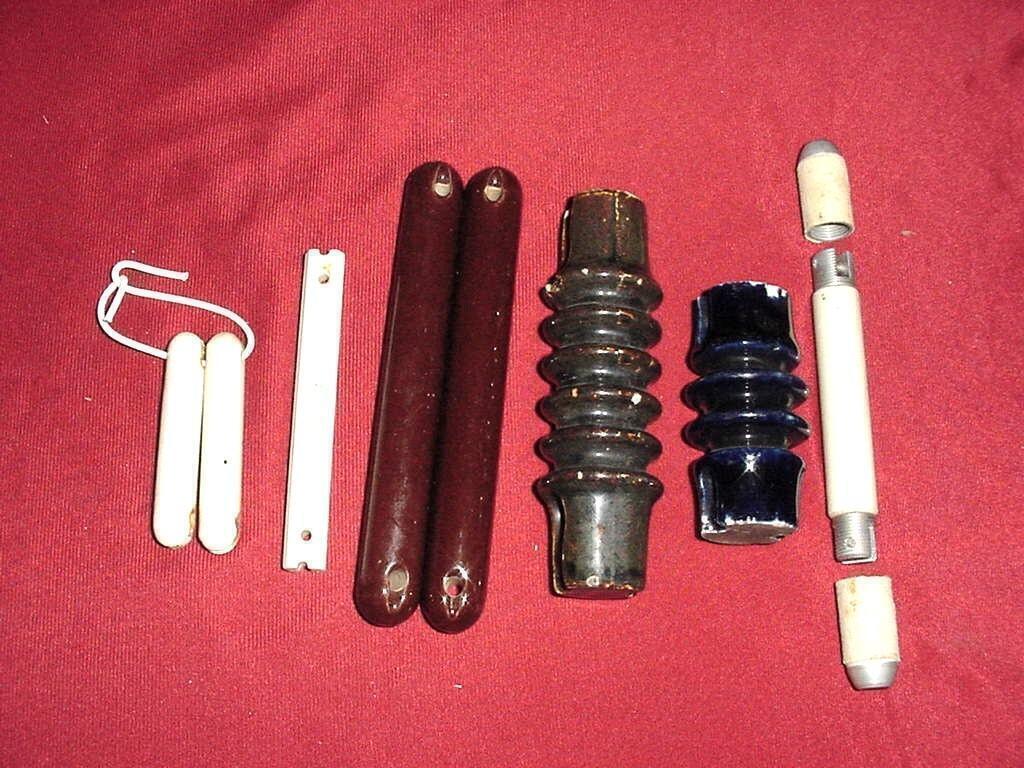This collection of eight Ceramic insulators is in excellent condition with no cracks or chips. They vary in application and could be end insulators or spacers or just support for wires. They vary from 2” to 6” in length. The largest two are 1.25” in diameter and the smallest round ones are 0.50” diameter. $18 shipped. I take Paypal, Postal MO or check.