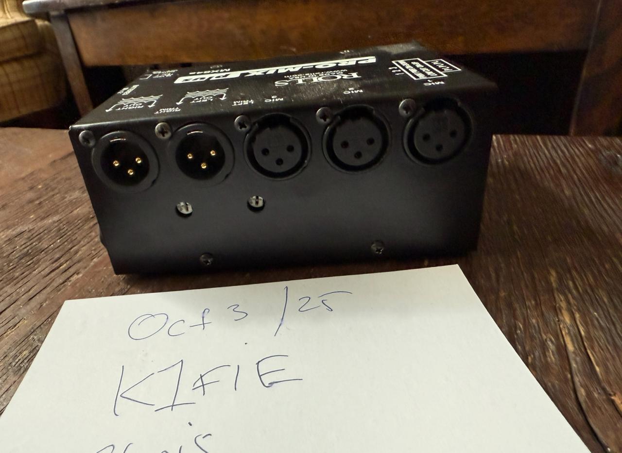 This professional grade Rolls Pro Mix Plus R54S 3 input channel, two output XLR mixer is perfect for sharing multiple XLR mics with two radios. Each has an independent volume control. 9V Battery or AC operated. Over $200 new! Made in USA. Perfect condition, nonsmoking home.