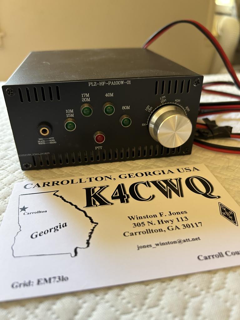 FOR SALE: PLZ-HF-PA100W-01 Chinese HF linear QRP amp, rated 100 watts out, but I checked about 70 watts. Small size, fan-cooled. Good for backpack, POTA. Has low-pass filter bandswitch. Comes with power cord, cord with 3-conductor mini-phone plug for PTT input signal. Never used except to test. I needed RF sensing switching and bought an RM Italy amp. This amp must be used with QRP radio that has relay switching output. Didn’t come with manual but can view similar 50-watt amp on UTube. $110 shipped to continental US address. Postal money order or check only. For more info, call 404-372-4995.
