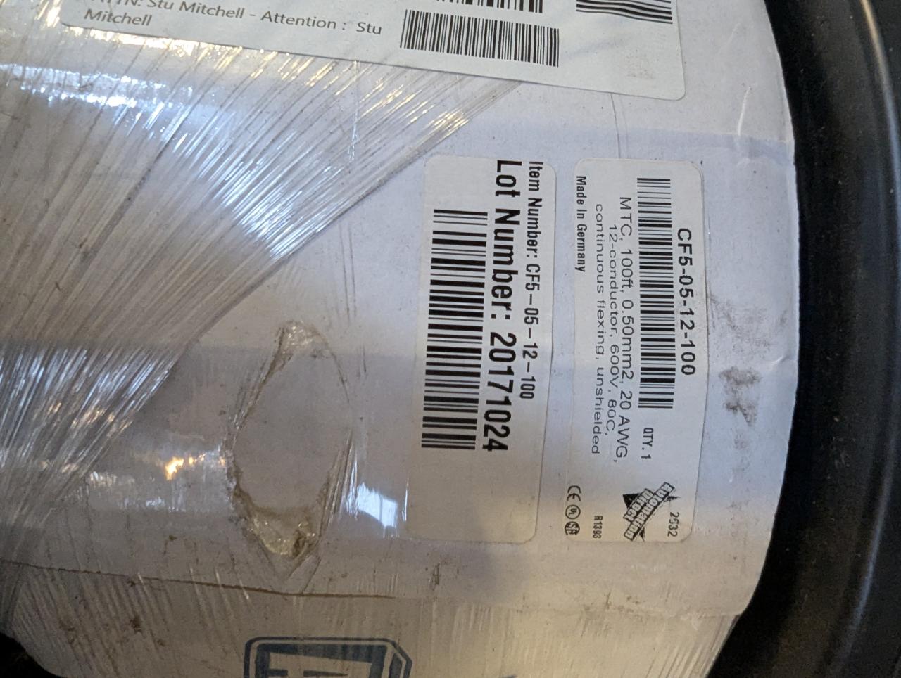 Automation Direct CF5-05-12-100 12 conductor flexible twisted pair cable on unopened spool. 20 AWG, 16 Strands. $220 plus shipping. Left over from a control/monitoring project project at my distillery. Call me 703-587-4680 or email at w4nf at comcast.net.