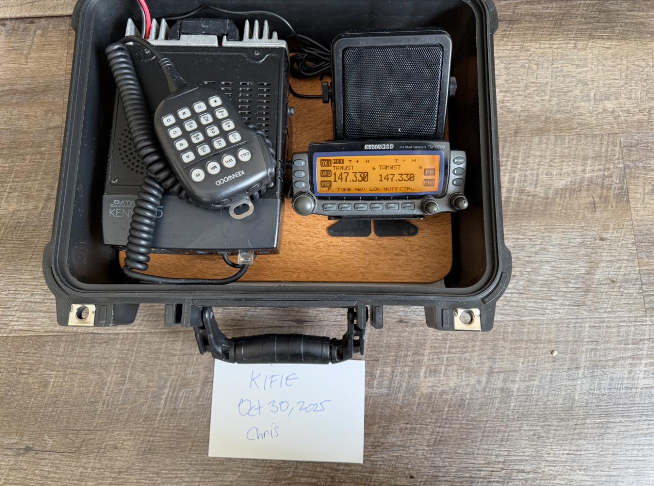 This is a ready to go POTA kit including the Kenwood TM-700 Dual Bander with Anderson power poles, MFJ-281 Clear Tone speaker, Kenwood hand mic with keypad, mounted in a black submersible padded Pelican case. The rig is mounted on finished wood, and the documentation is underneath the wood tray.