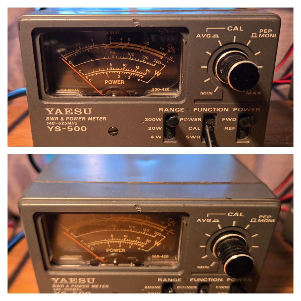 These little Yaesu YS meters are built like a tank. This one looks to have led a rough life but when compared against my other VHF/UHF meter, it gives the same readings. Since it requires no power, this would be a good meter to use in the field for portable operation. More photos available upon request.