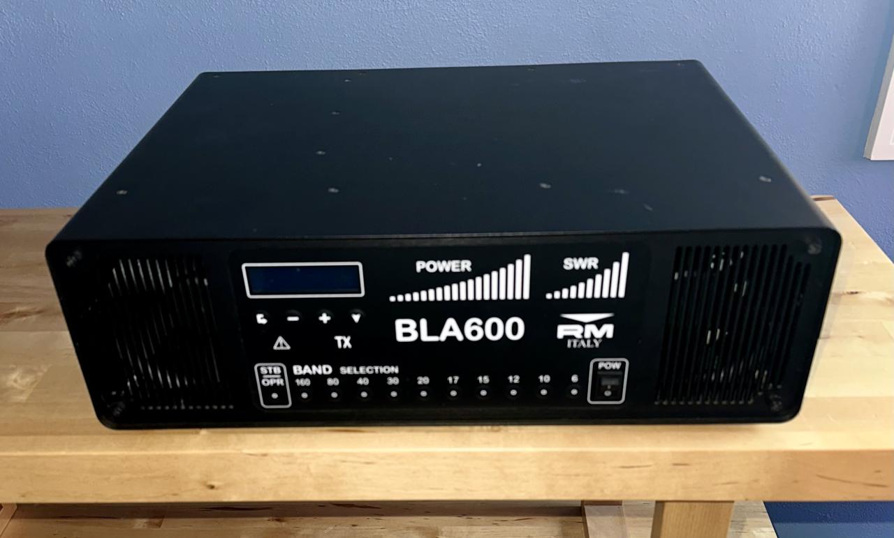 Offering this RM Italy BLA600 amplifier for $900. I used this amp for a few months on CW. It works as it should with full power output and low drive, and cosmetically it is very clean. Full disclosure: what I don’t like about the amp is that the transformer hums at higher power levels, which annoys me to the point that I don’t use it. The transformer hum is much less pronounced in voice modes. It is heavy, and I will ship it at your expense, but I’m willing to drive a couple hours from West Michigan to make a deal in person. It is wired for 240 VAC, but that’s easy to change. If you would like a robust 600W solid-state amplifier and don’t mind a little transformer hum, make me an offer. The sale includes the amplifier, the original manual, and a power cord. More pictures are available, contact me first via QTH. If the ad is up the amp is available.