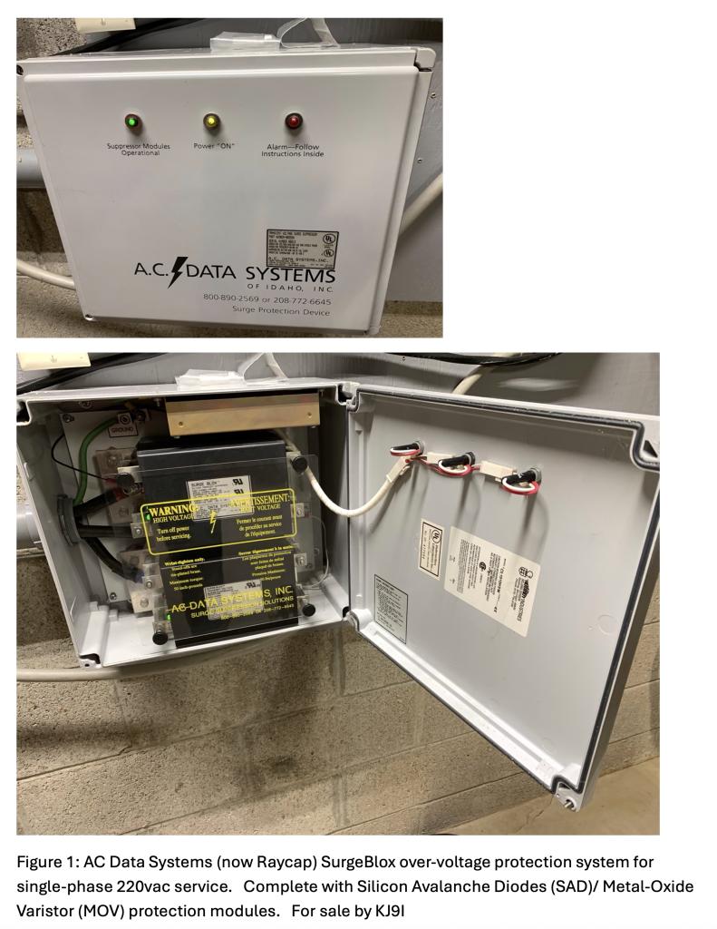 For Sale AC Data Systems (now RayCap) SurgeBlox commercial grade over-voltage protection system. Original owner, pet-free and smoke-free since new. Install across AC panelboard mains to protect agains over-voltage. Runs self-diagnostics and gives visible alarm (lamp on front) if a module fails. If this happens, contact RayCap and they replace the module (no cost) and sometimes request to retrieve the failed module. I have only had one failure on a lightning strike which was quickly replaced and works perfectly ever since. Combination of Metal Oxide Varistor (MOV) and Silicon Avalanche Diode (SAD) protective modules. $450 shipped continental USA. Cost over $3,000 new.