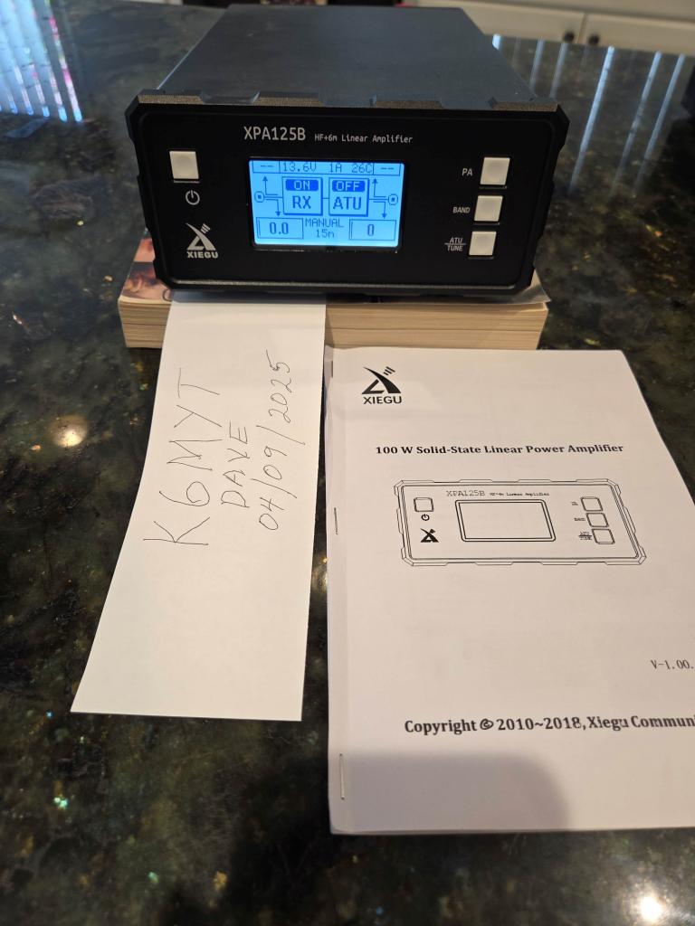 Xiegu XPA 125B Power Amplifier. The amplifier covers 160 meters through 6 meters. It requires a maximum of 5 watts input power to produce up to 100 watts output power. 100% Solid State. I have used this amplifier with my ICOM 705. It is nice to have extra power when you need it! There is a built-in Antenna Tuner that can handle from 14 ohms to 500 ohms. An external DC power supply is required. Amplifier is in excellent condition.