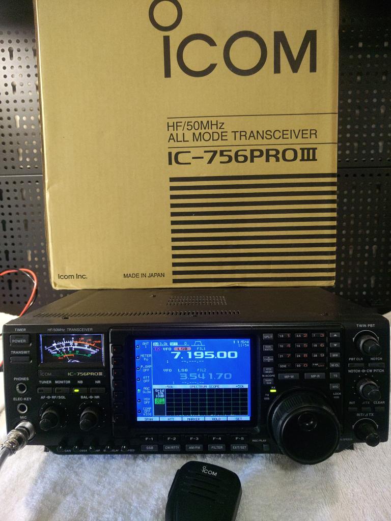 For Sale is my Icom IC-756ProIII. I believe this is one of the last batch made. Excellent condition. No marks what so ever. Works perfect. Bright display. Very little use since new. Comes with power cord, manual, HM-219 hand mic. I will sell for $750 plus $40 for shipping. Check, postal MO, Pay-Pal is fine. Never around smoke. The radio has not been Mars modified.