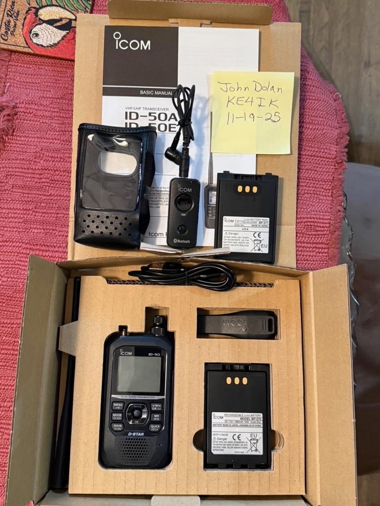 For sale, my Icom ID 50a Dual band FM/DStar Handie. This HT was purchased this year at HRO (will include invoice.) It is in Excellent condition having been always kept in the Icom case. Comes from a Non-Smoking shack. I decided to keep my ID 51 plus2.