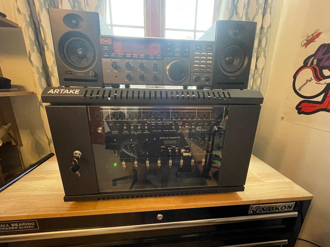 Up for sale is my K7DYY AM station. The DYY will do legal limit AM on 40 and 75 meters. The station consists of the DYY, a Behringer Audio Processor and a Max Limiter all mounted in a 6RU rack cabinet with a glass door. The rack cabinet also has a surge protector power strip mounted in it. The receiver for the station is a JRC 525 receiver and a set of powered speakers. All of the needed connections are on the back of the rack and are labeled. The system works great but I find I just use my Collins 20V3 more. Just hook up your mic of choice and an antenna and you're on the air. More pics are available. I'd prefer not to ship, but I will at buyer's expense. $2100 or possible trade for HF amp. Please feel free to contact me with any questions.