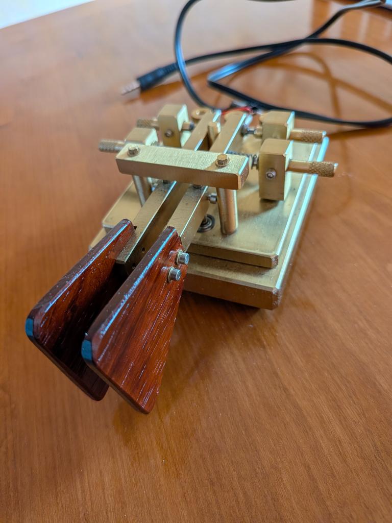Original owner. Heavy solid brass With walnut paddles. Very good overall condition with some oxidation on parts of the brass. Includes cable with 3.5mm plug for contemporary keyer jacks.