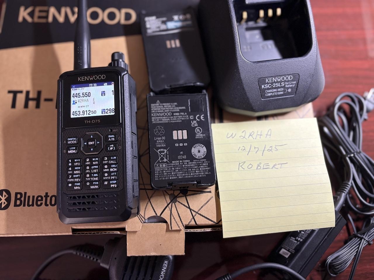 Hardly used Kenwood TH-D75. Perfect condition. The box with everything originally in the box included: radio, antenna, battery, belt clip, manual, power adapter. Plus genuine Kenwood desktop charger and two after market batteries (3 batteries in total). Price $600. Selling because I also have an Icom ID52A plus that I prefer.