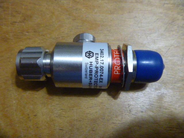 New, never used. HUBER+SUHNER part number 3402.17.0074-Ex is a Type N coaxial lightning arrestor/EMP protector. It is designed to safeguard electronic equipment from electromagnetic pulses (EMP) and lightning strikes, primarily in outdoor and industrial telecommunications applications. Effective from DC up to 2.5 GHz. Has Type N male on one end and Type N female on the other. Made in Switzerland. $45 shippd USA only. Payment via USPS money or or personal check.
