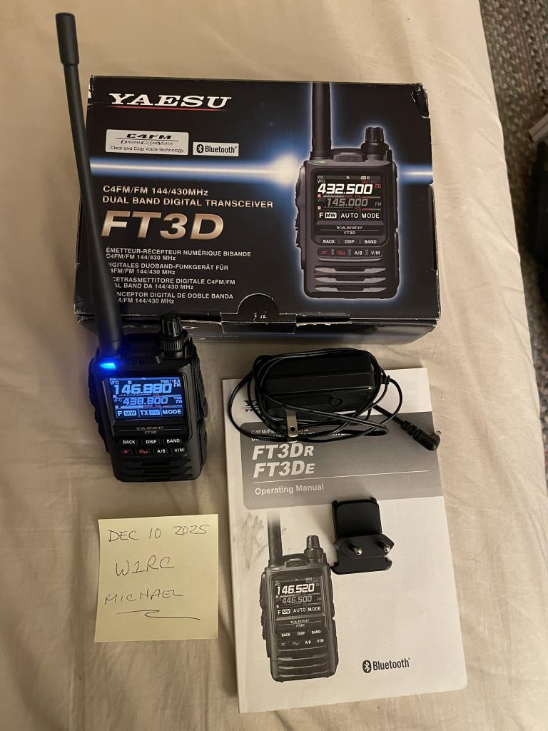 This Yaesu FT3D is in really great condition, no marks, scratches or blemishes. Comes with new aftermarket 2200 MAh battery, charger, printed manual, original packaging. Not shown is the belt clip. $265.00 includes shipping and insurance. ZELLE preferred payment method, USPS Postal Money Order, checks, etc. email W1RC if interested,