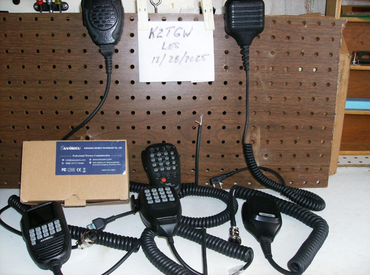 [Kenwood MC-43 sold], Yaesu MH-59, [GWR ?] with no plug [5 wire mic cord], speaker/mic works with Anytone-Boufang-Qauntrang and a [no ID] with no plug [5 wire mic cord] Trade for a large faced Hotspot or ?