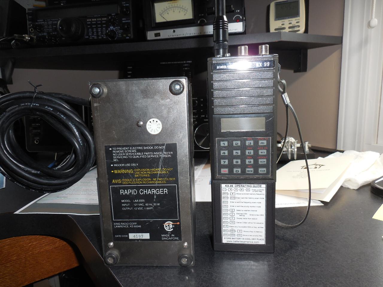 Included in the sale is the transceiver (Bendix/King KX-99), rapid drop-in charger (Model LAA 0325) and upgraded extended range antenna (Gabil Radio wide band GRA-RH795 70-1000MHz). I do not have a manual but that can be downloaded from manualslib.com free of charge. Frequency range is 108 to 136.975 Mhz Coms plus 161.50 to 163.275 weather band. Transceiver has VOR function for navigation. Unit works fine. Battery is in good condition.