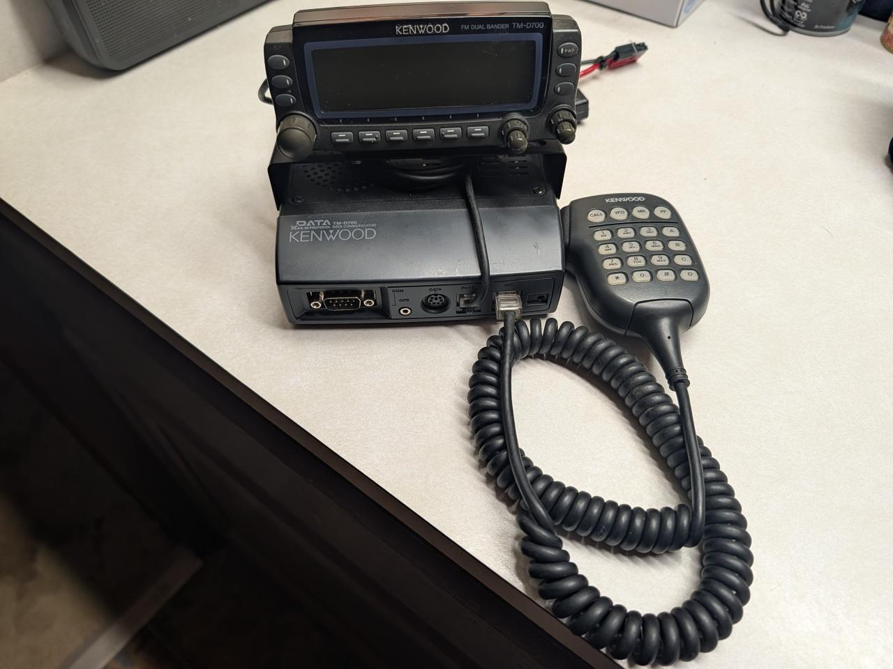 Clean functioning Kenwood TM-D700A with a short power cord terminated with Power Poles. Includes radio mounting bracket and the head side of the faceplate bracket. I don't have the other half of the faceplate bracket. I had feet on the bottom of the radio and used it setting on my desk in the shack. More pics available upon request.