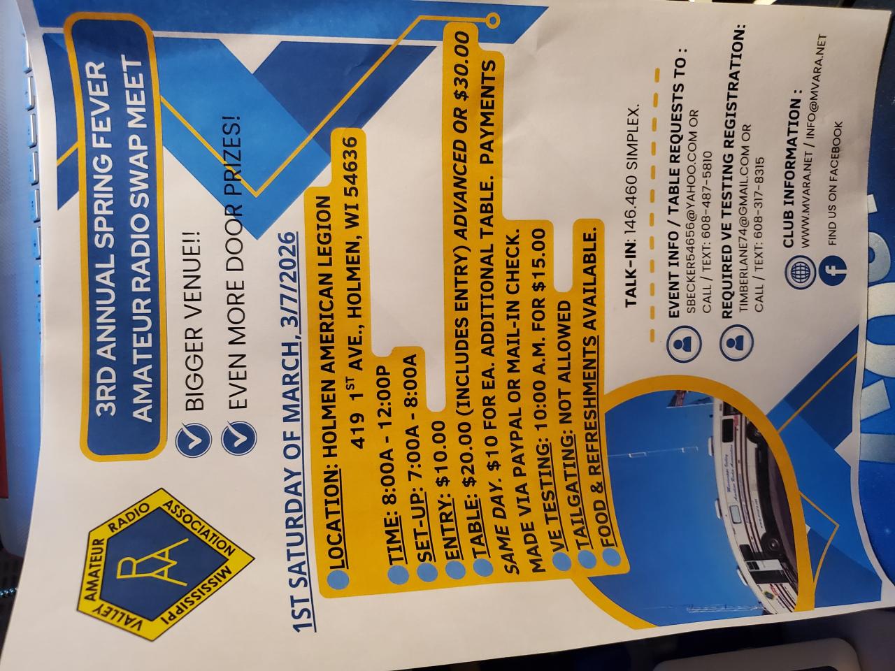The Mississippi Valley Amateur Radio Association will hold its 3RD annual SpringFever Swapmeet on MARCH 7TH 2026.