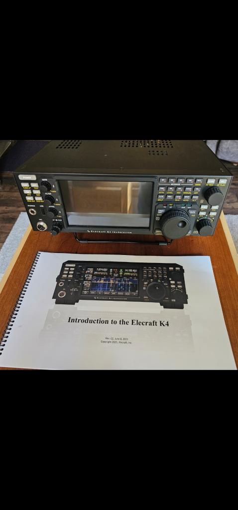 ELECRAFT K4 Transceiver. Excellent rig. NO scuffs, pets, smoke or FT8. Fantastic transmit audio. (ESSB). Quiet receiver. Elecraft CW as always. W/O tuner or mic...but easily upgradable to suit your needs now, and in the future. Factory setup manual and unbelievable "on screen" manual in the software. All boxes. $4300 shipped. I see some K3S's close to this price. Buy the latest technology. Respond through qth classifieds