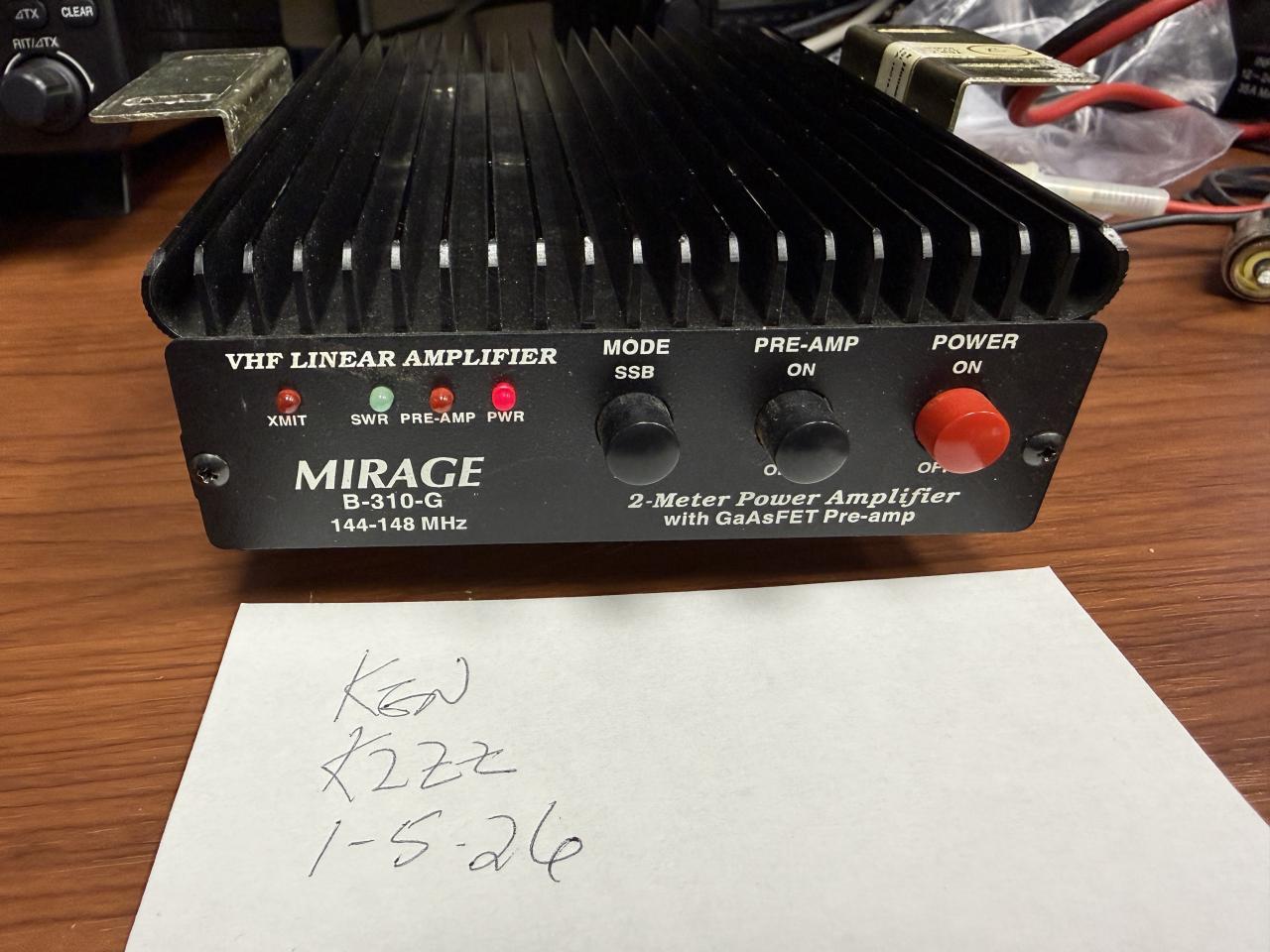 I have for sale my Mirage B310g 2m mobile amp. Comes with brackets to mount for mobile use. This is a 100-watts 2m amplifier. Preamp does not work
