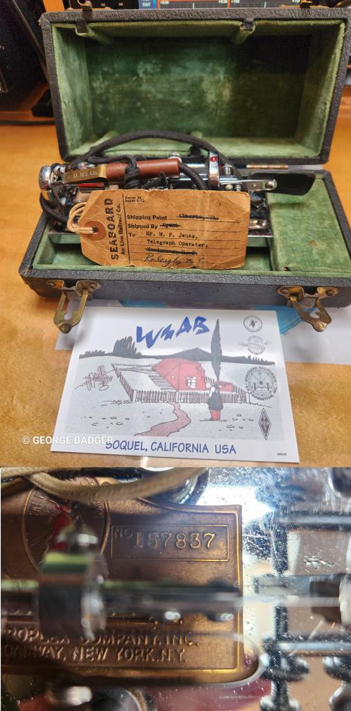 This is a 1948 Vibroplex Blue Racer Deluxe with Railroad provenance that is fully operational. Not restored, so it has the original patina. It comes in its case that is functional. It has the Seaboard shipping label with the owner's name listing him as a telegraph operator. The prior owner modified the finger pieces to accomodate their style. It also comes with the original Western Union Telegraph Co wedge connector.