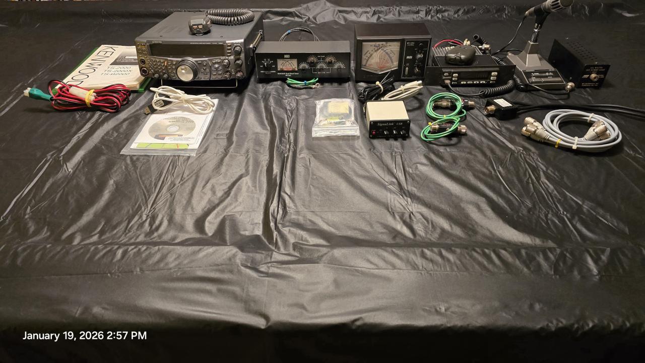 Kenwood TS-2000 w/manual & RTprogramming software & cable, Kenwood TK-780 UHF mobile radio, MFJ-923 UHF/VHF antenna tuner, MFJ-894 1.6-525 Mhz. SWR meter, SignaLink USB soundcard, Kenwood MC-60 desk mic, MFJ-260 300watt dry dummy load, MFJ-270MF Surge Protector {2}, Jetstream JDPUP 2m/70cm duplexer, {4} pre-manufactured coax with connectors. $800.00 cash or Postal M.O. Will not seperate.