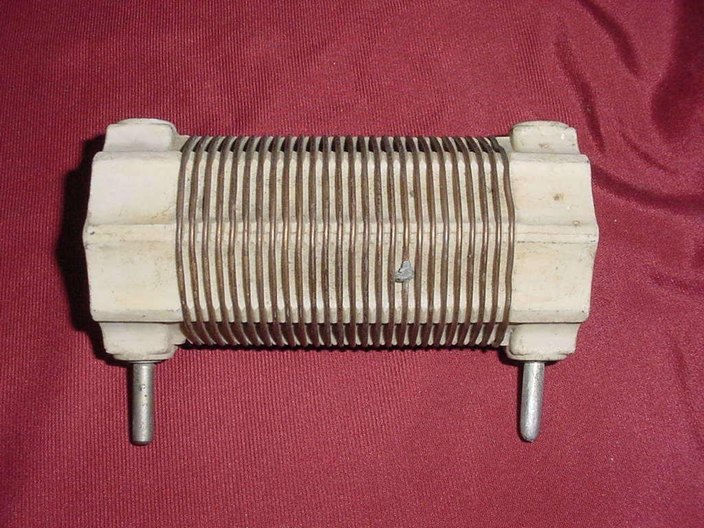 This heavy ceramic coil form is 2. 5 inches in diameter and is 5 inches long. It has groves for 25 turns and has 22 turns on it. Diameter of the windings is 2.25 inches. There are mounting holes on one side of the form and pins that the winding is terminated at on the opposite side. $37 shipped. I take PayPal, Postal MO and check.