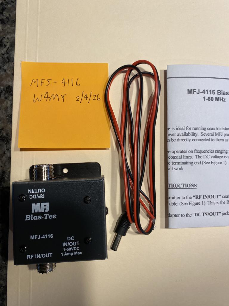 For Sale MFJ-4116 Bias-T for injecting and extracting DC voltage into a coax line to power remote devices. This one works in applications for 1 - 60 MHz. $25 plus $13 flat rate shipping to USA. I have two. Money order, check, or cash only please. 73 Marty W4MY