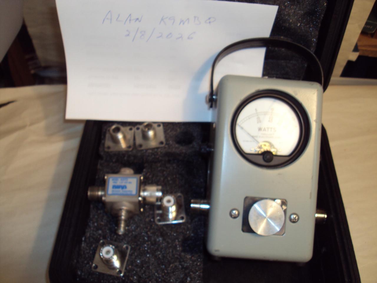 From an SK estate, this a THruline BIRD directional Wattmeter Model 43 (ser 240799) Plus a 12 Slug kit in carrying case. Wattmeter pkg includes Carrying case, Model 4273 1.5-3.5 Mhz scope connector, 2 N-connectors, 2 spare SO 239s, and Aluminum shorting slug. The Slugs in the kit are as follows: 2-30Mhz – 100W, 500W, and two 1 KW; 25-60 Mhz – 500W & 1KW; 50-125Mhz – 100W; 100-250 MHZ – 5W & 100W; 200-500Mhz – 100W; 400-1000 Mhz – 5W & 50W. Price: Model 43 pkg - $250; Slug pkg - $750; Package Price: $875 plus $35 shipping. Paypal accepted. Contact Alan K9MBQ in Charlottesville, VA. More photos availaable.