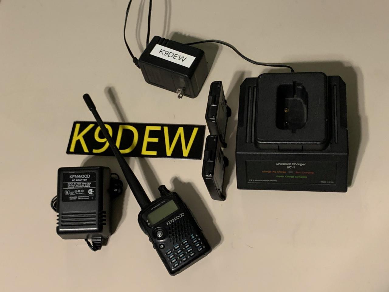 Kenwood TH-F6 144/220/440MHz wideband receiver triband handheld. Comes with two good used batteries, original metal belt clip, original Kenwood antenna, a UC-1 drop-in charger, and a Kenwood AC wall charger. Well taken care of and fully functional, nice front panel buttons not worn, radio housing/case not cracked or damaged, side port cover 100% entact.