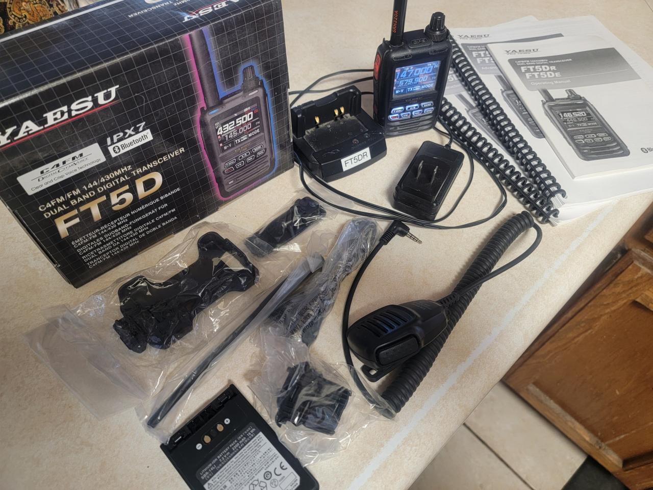 I have a Nice clean like new Yaesu FT5D with all the accessories that it came with. Extra printed manuals, an extra Yaesu battery, a SSM-17A Speaker mic, and the drop-in charging station. $350. shipped conusa.