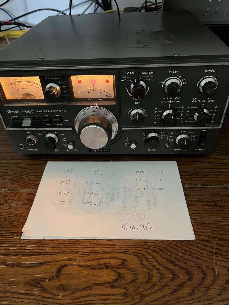 Great condition Kenwood TS-520. Clean with full output except for the 28.5 MHz band. Bad switch contact???.