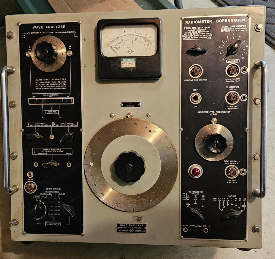 Something for the collector of the unique, someone interested in vintage/antique audio/acoustics, or maybe someone just interested in the potential tubes/parts content. Full model is FRA2TcAT3a. This is essentially an audio spectrum analyzer that was used for acoustic signal analyses in a testing lab. Vintage 1962-63, made in Denmark. This has been with me for decades, and it's got to go! It's somewhat dirty, but I did a very quick once-over cleaning on the middle section of the front panel & based on that I think it should clean up OK. It's complete, including tubes, but no power cord, no external attachments/accys. The orig. manual w/schematic is included. Last operated ca. 1980, and it worked well then (yeah, I know, "it worked when last used"...). It has NOT been powered up since then, and SHOULD NOT be powered up now prior to having it thoroughly gone through.
