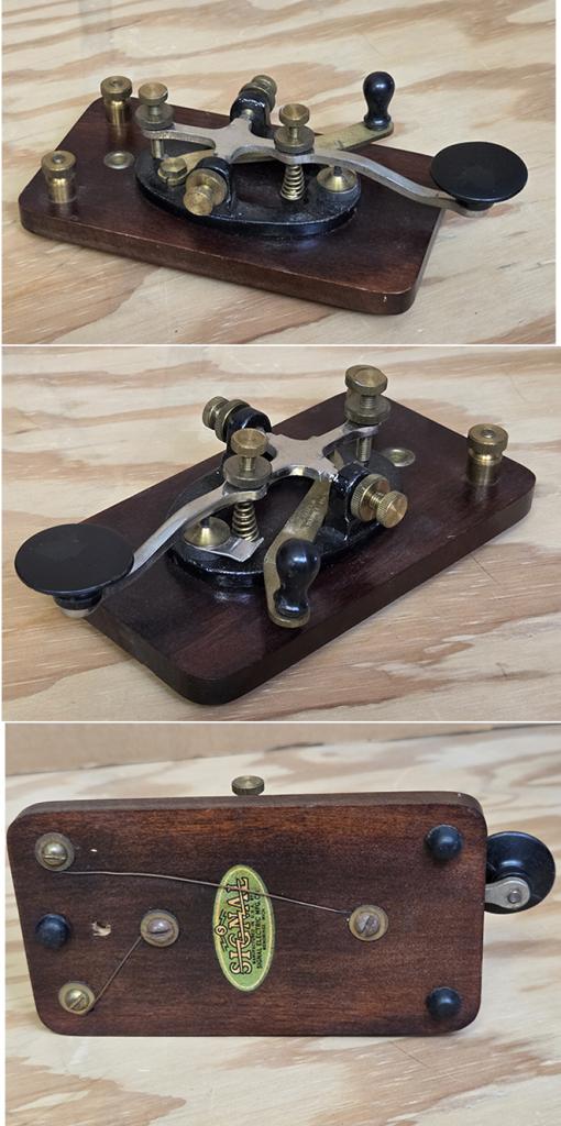 This is an unusual Signal Electric key, mounted on its original wood base, with the original Signal Electric Menominee label on the bottom. These were made in Michigan, along with other Signal company keys and sounders. This one is in very nice condition, and might have been used as a practice key. I can see no cracks or scratches in the wood, and all the parts look to be original, although I am not sure about the rubber feet. . The shorting bar is engraved with “Signal Electric Mfg. Co. Menominee Mich.” $140.00. Shipped CONUS. PayPal is OK.