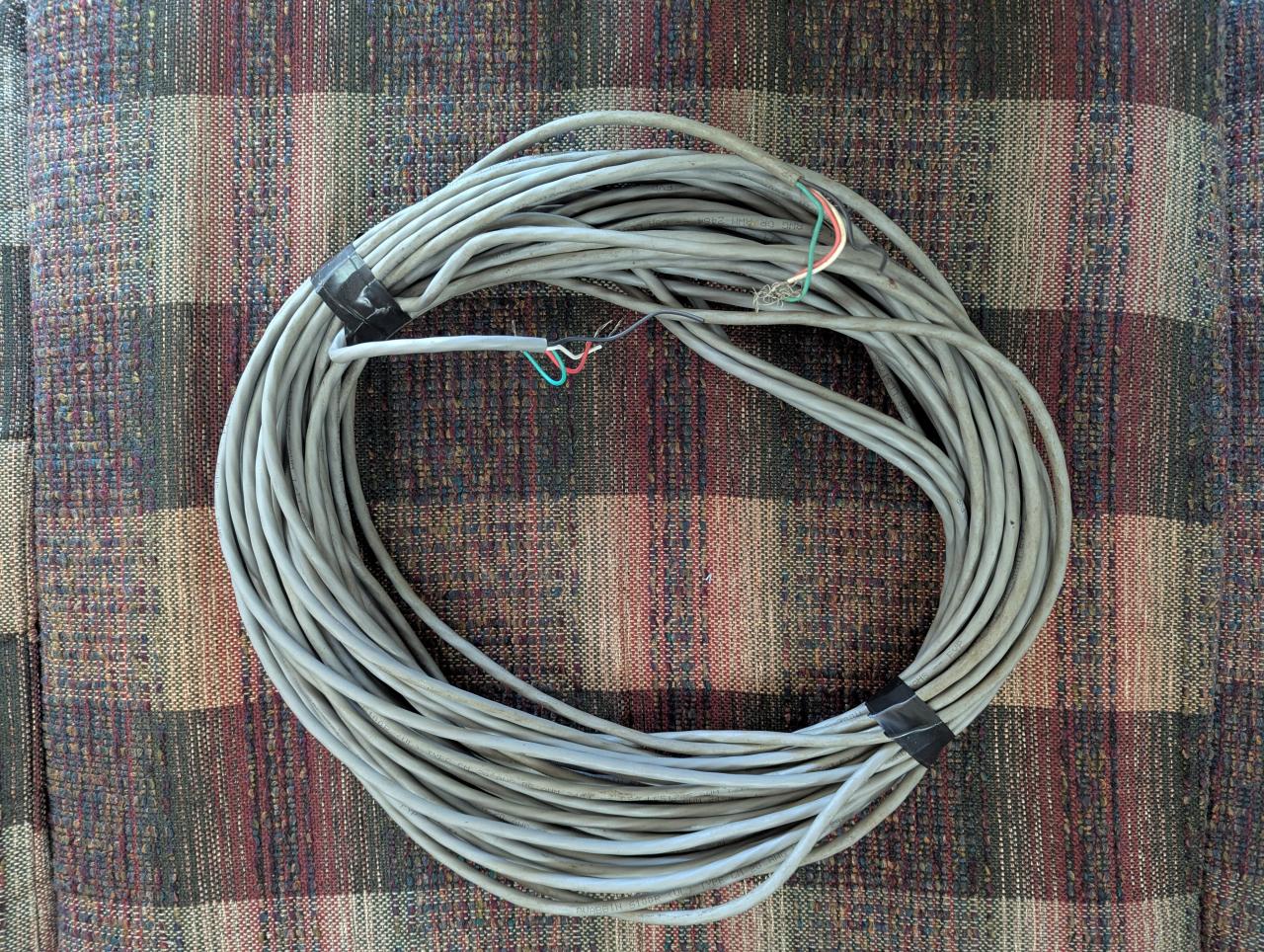 Here is 100 feet of 4 wire conductor cable. The outer color is grey with white, red, black and green 20ga wires. Used but still in very good condition.