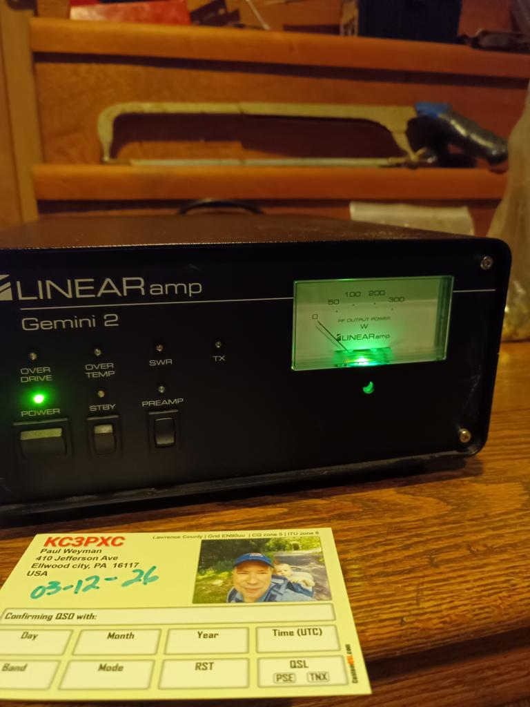 I am selling a Gemini 2 VHF 300 watt linear amplifier that's in good condition. Still functions great and no issues. It Does need a PTT cable to operate. It's not RF driven so keep that in mind. Non smoking QTH. It's heavy so I would prefer a face to face deal within 75 miles in Western PA. Buyer will pay shipping if they prefer. I'm estimating about $80 to $90 to ship in the Continental US. No RETURNS. Please contact me for further questions or interest.