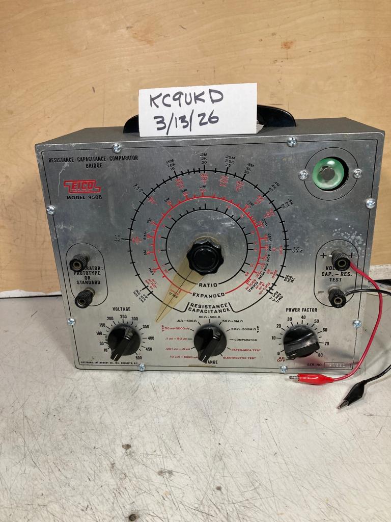 EICO RESISTANCE -CAPACITANCE- COMPARATOR -BRIDGE 950B #21551 $50 PLUS SHIPPING This vintage working EICO 950B capacitor checker is in fair to good cosmetic condition. I replaced the 2 power supply filter capacitors and 6 paper capacitors with modern ones, and cleaned all switches and potentiometers. I successfully measured several capacitors both for value and leakage. It can be used to check a capacitor both for value and leakage. It is also great for reforming older electrolytic capacitors. A set of test leads is included. Shipping will be within continental USA only, no international shipping.