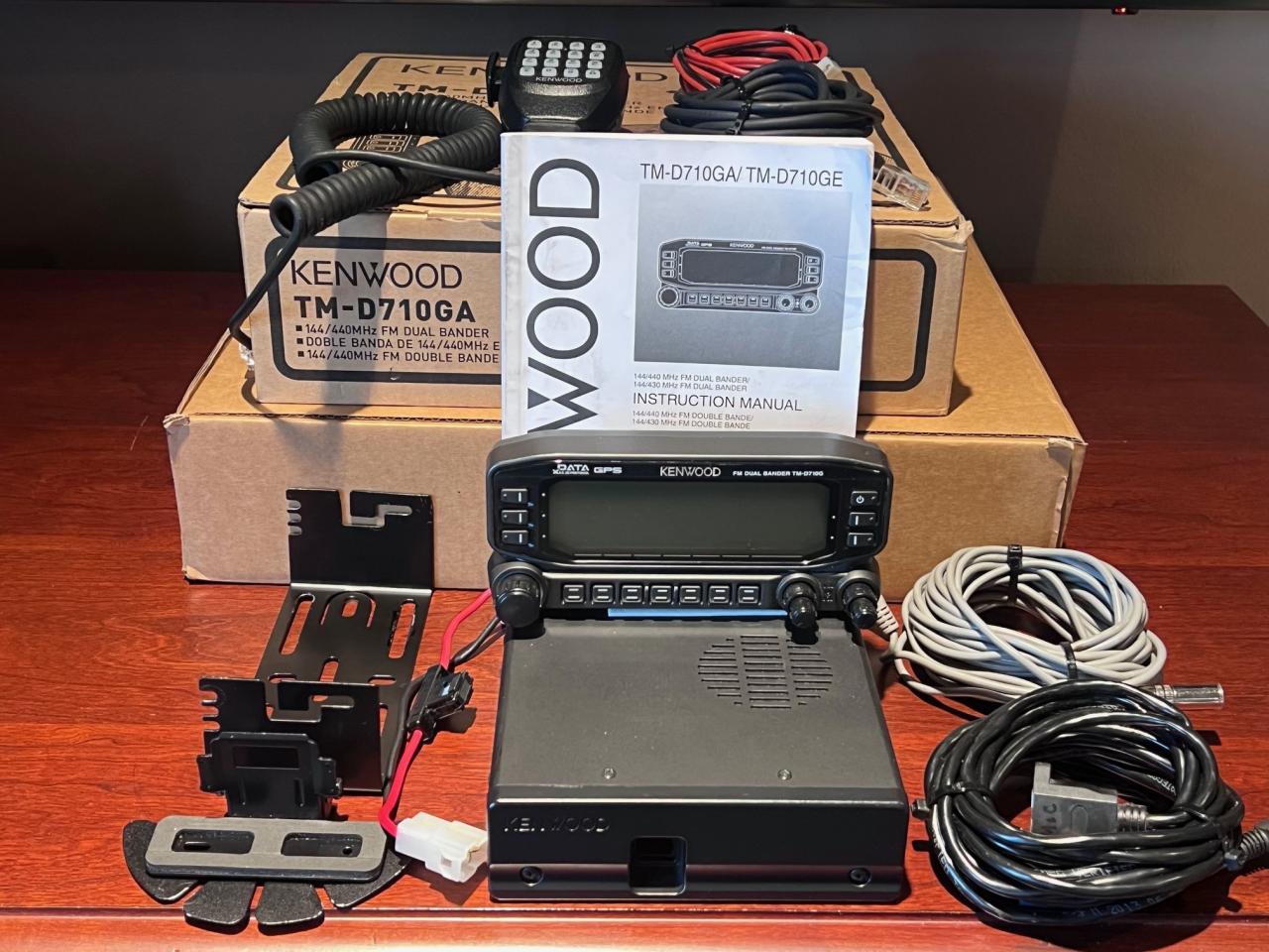 For sale is a Kenwood TMD710GA VHF/UHF transceiver with APRS. In very good cosmetic & electrical condition / works well. Used very little. Includes the transceiver body, control head & mount (display is perfect), matching Kenwood mic (with keypad), mic extension cable, DC power cable and interface cable that goes between the transceiver body & control head. Also comes with transceiver body mounting bracket and hardware, audio extension cable and Kenwood TM-D710GA instruction manual. Includes original Kenwood factory shipping box and inserts. Sell for $700.00 shipped CONUS double boxed.